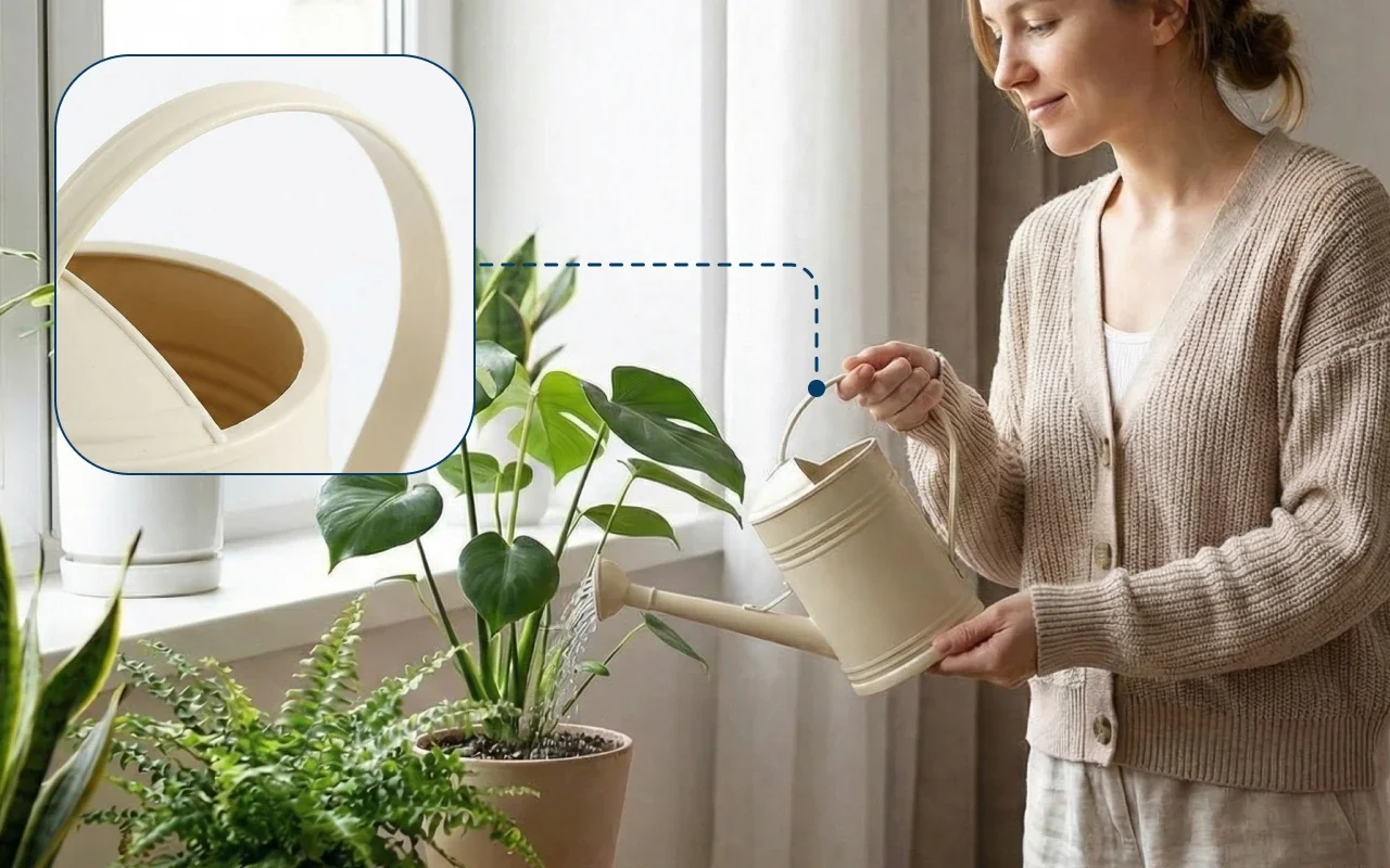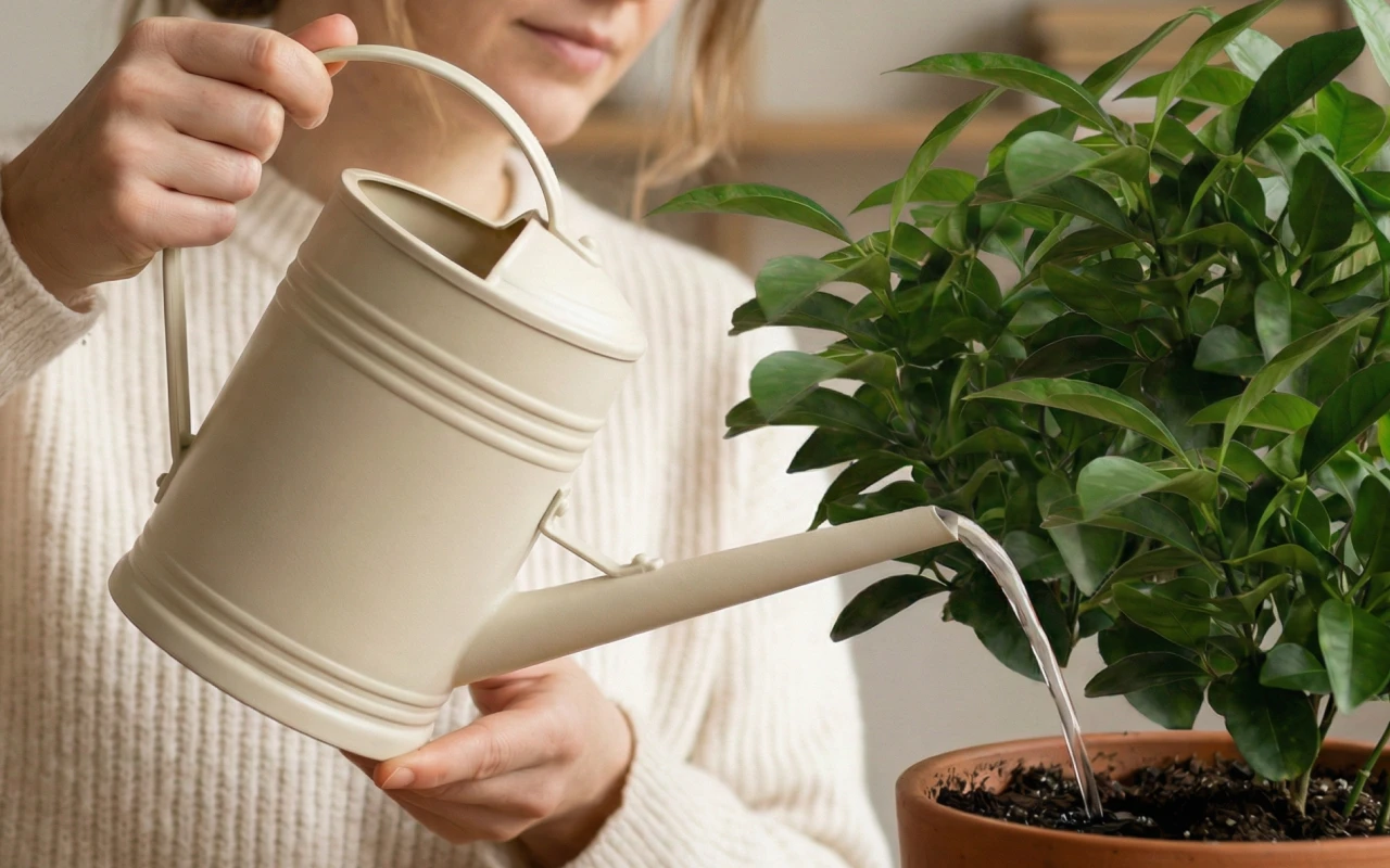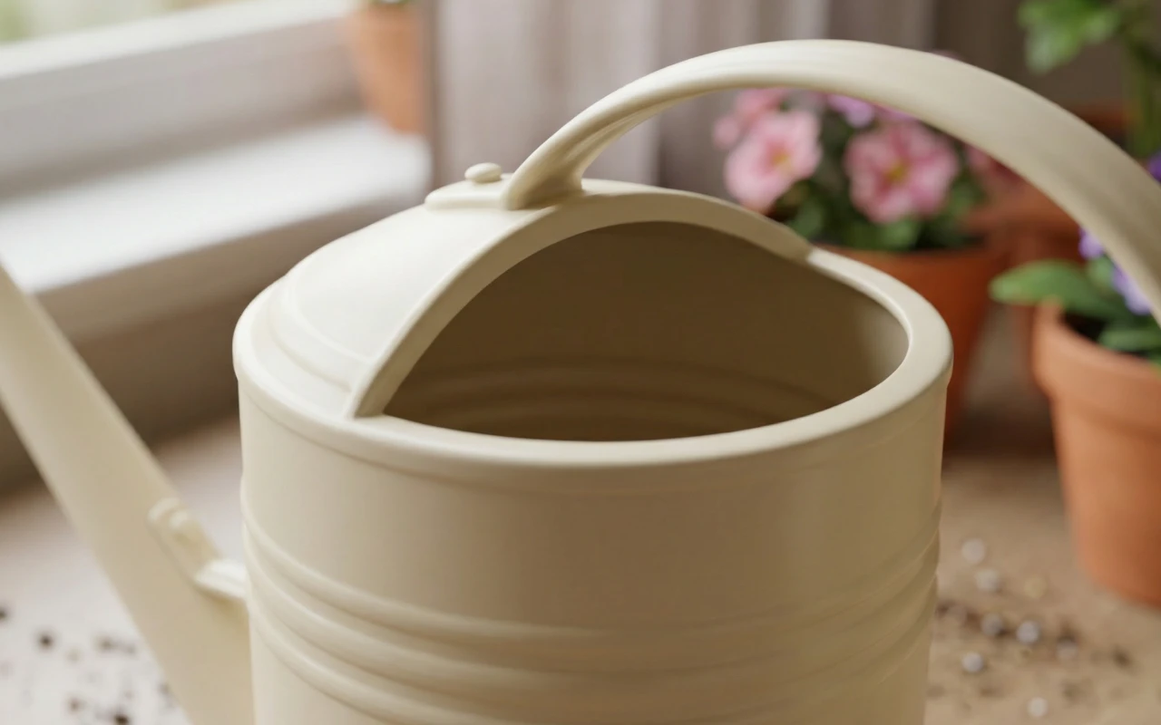 Gura îngustă ghidează fluxul direct în sol. Acest lucru ajută la evitarea stropilor pe frunze, podea și mobilier.