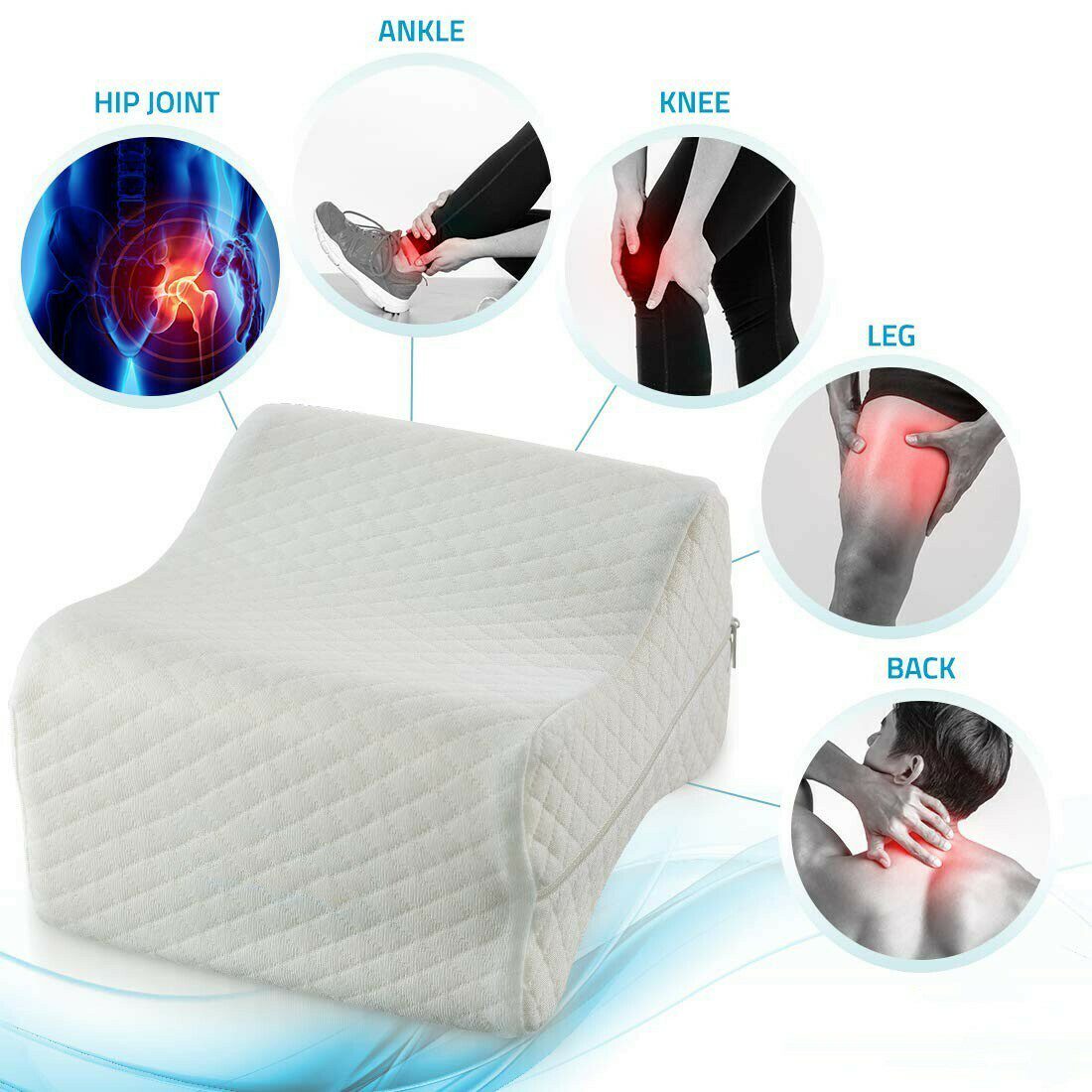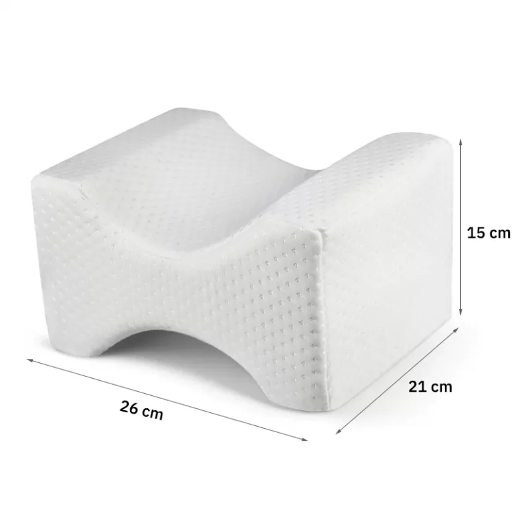- Persoanele cu dureri lombare sau de genunchi — Perna separă genunchiul superior de cel inferior și creează spațiul corect între ele. Menținerea alinierii picioarelor și genunchilor reduce durerea, oferind confort pentru partea inferioară a corpului pe timpul nopții.