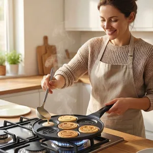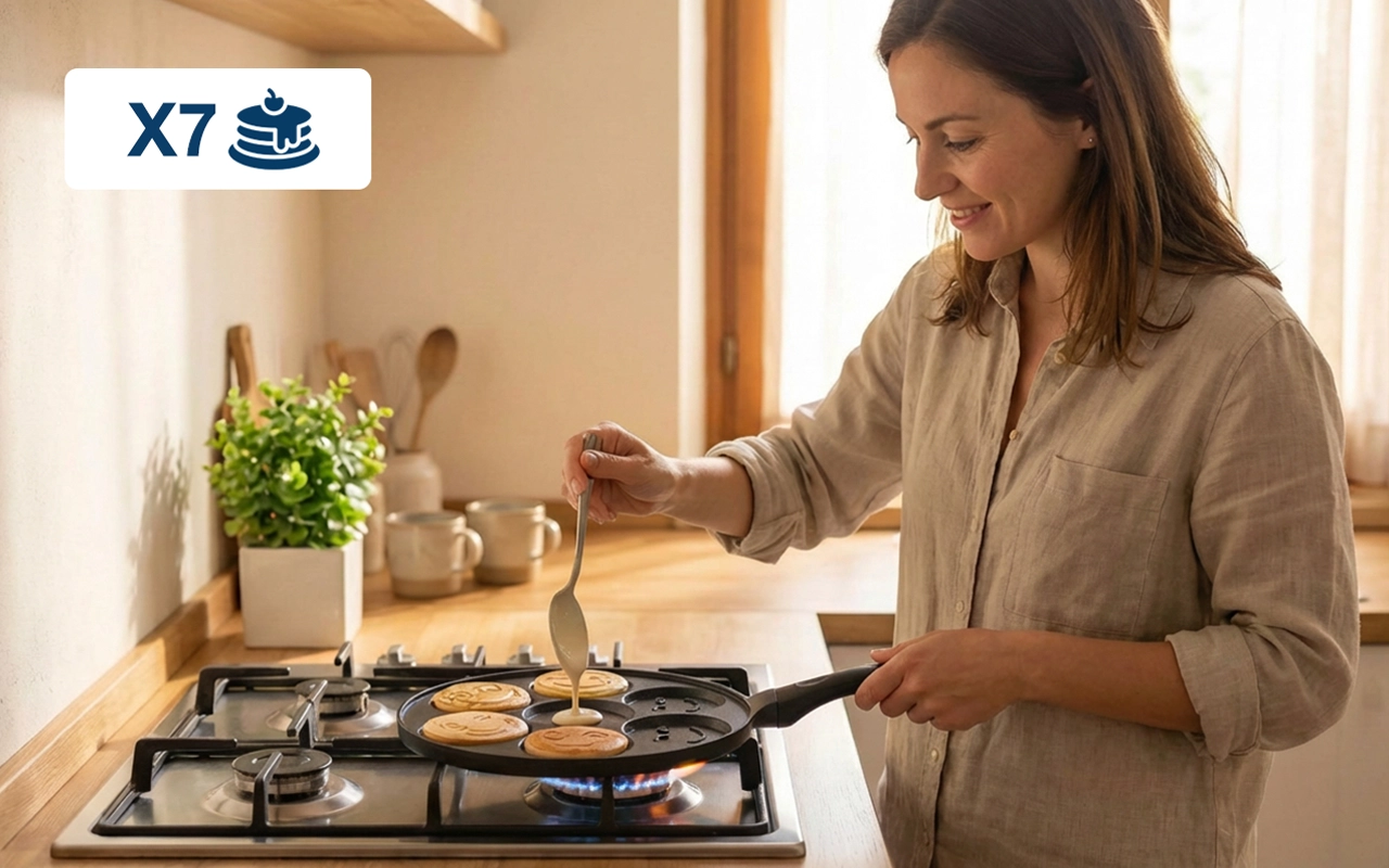 Șapte forme te ajută să servești pe toată lumea fără să aștepți mai mult. Tigaia pentru clătite Nygex se încălzește uniform pentru rezultate sigure în fiecare zi.