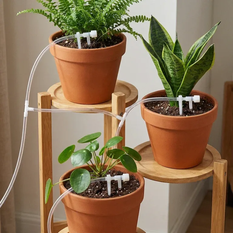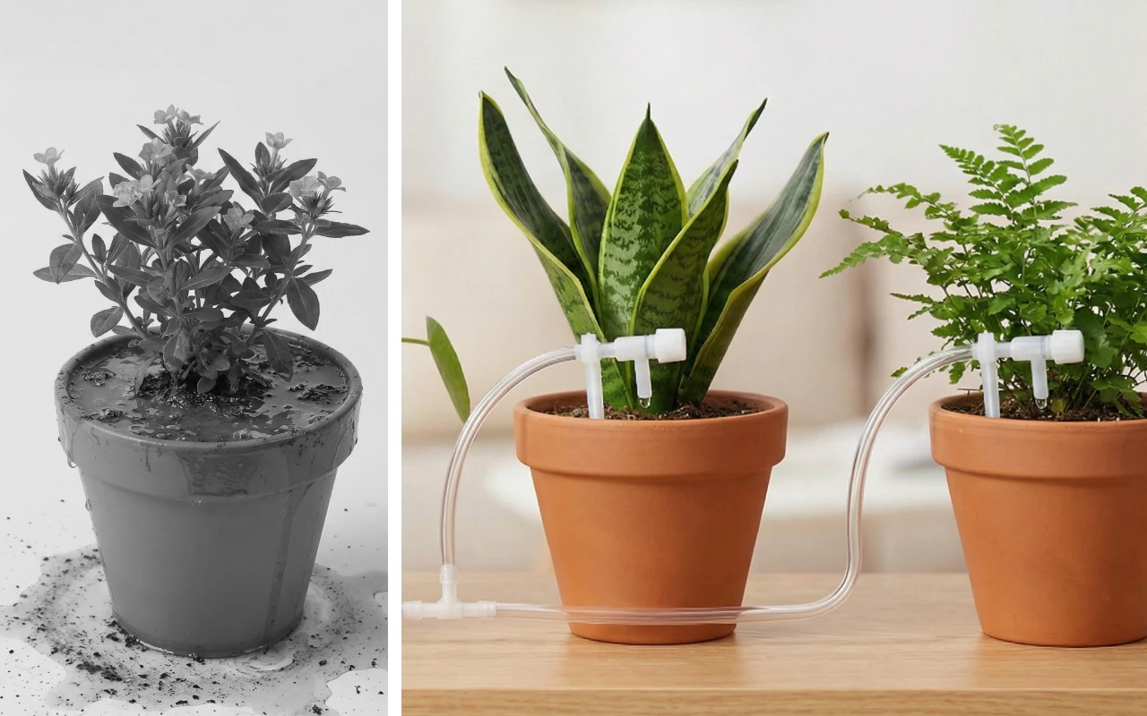 Apa ajunge direct în compost, menținând suprafețele curate. Nicio stropire pe frunze, pereți sau pervazuri.