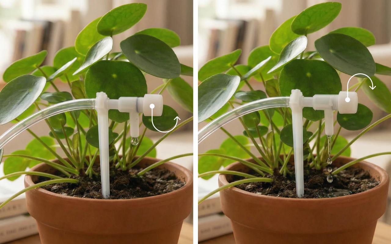 Rotește cadranul pentru a seta picături delicate. Fiecare duză hrănește uniform rădăcinile, reducând zonele uscate.