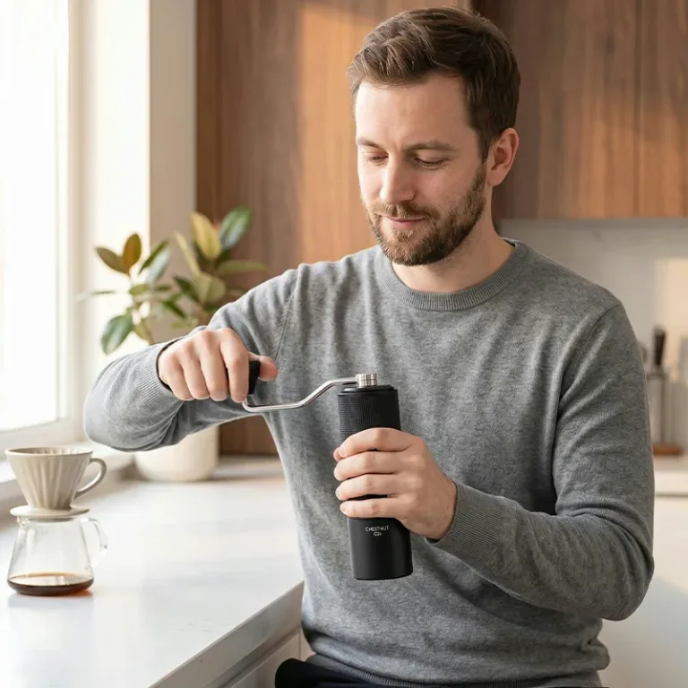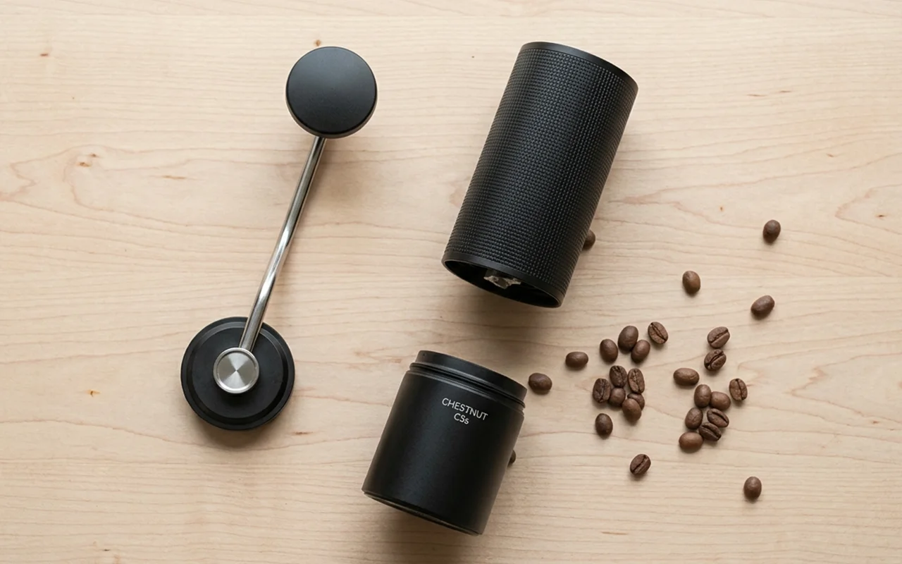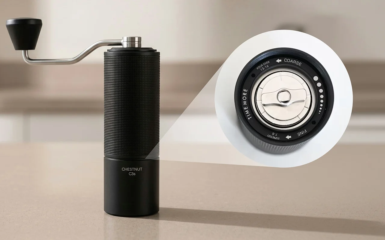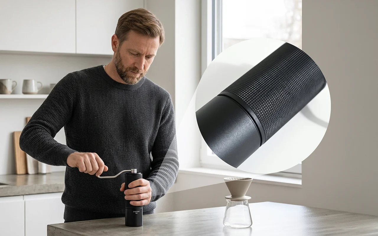 Râșnița Nygex se reglează rapid de la presă grosieră la espresso fin. Clicurile simple oferă rezultate repetabile, eliminând ghicitul din prepararea cafelei acasă.