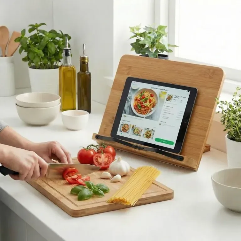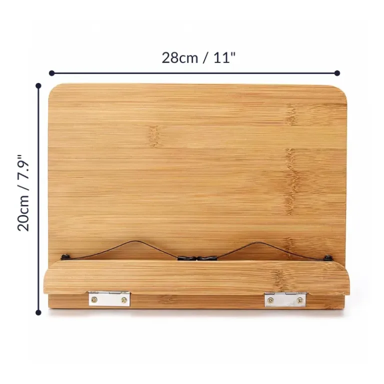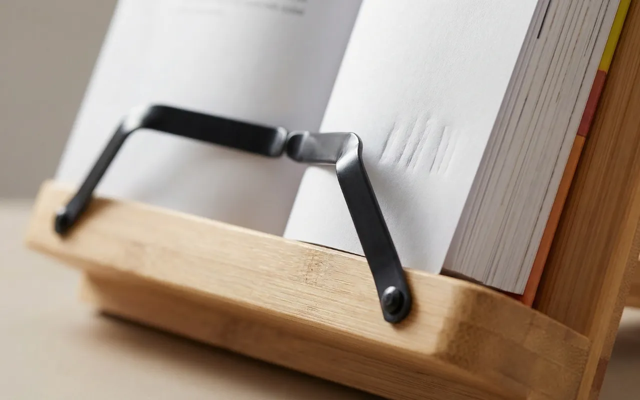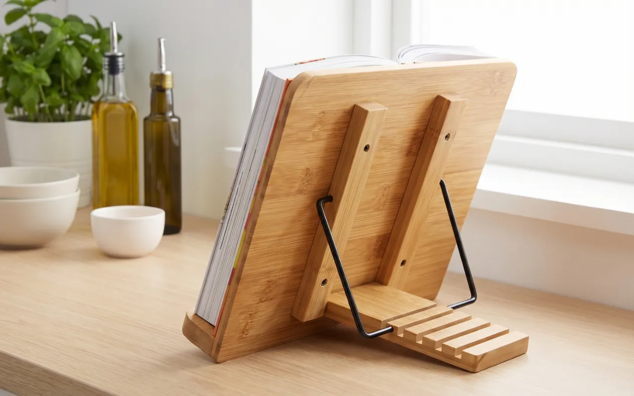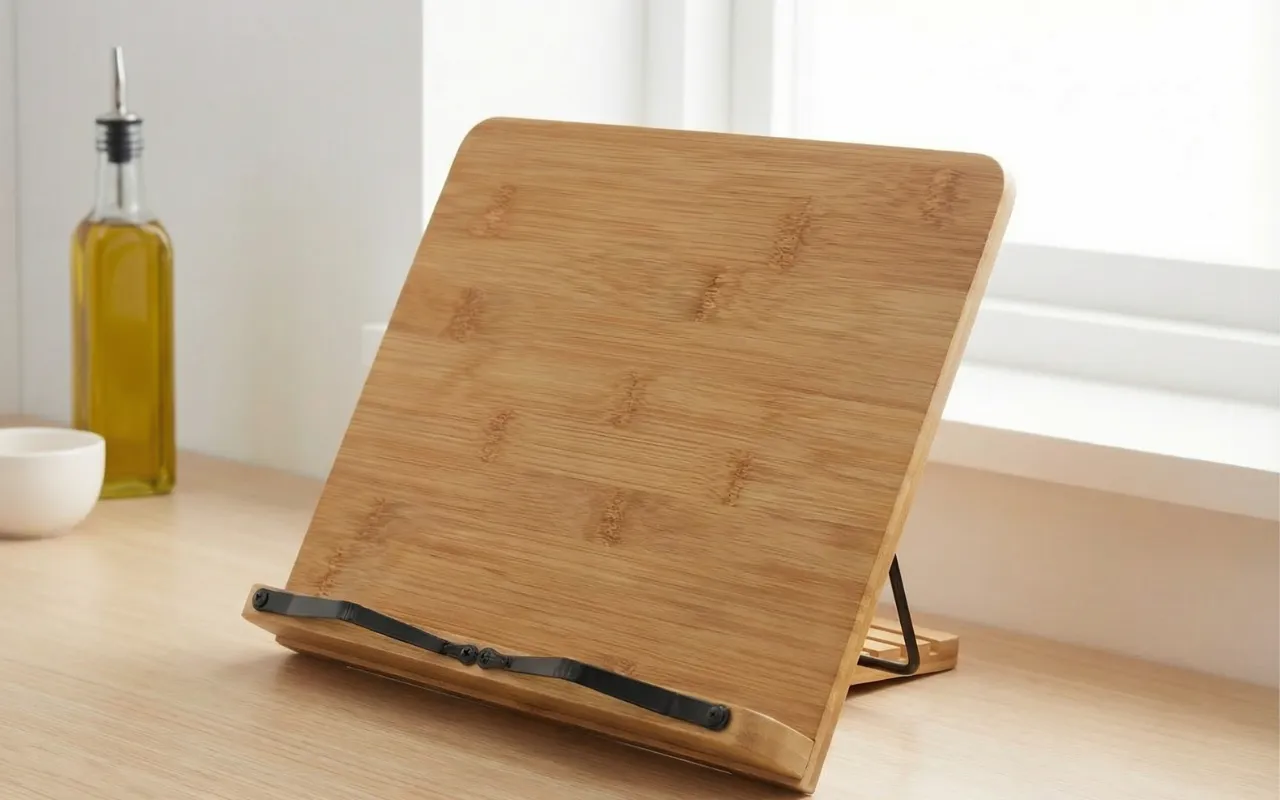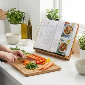 Suportul pentru cărți de bucate Nygex menține paginile stabile în momentele aglomerate din bucătărie. Mâinile rămân libere pentru tocat, amestecat și manipularea în siguranță a tigăilor fierbinți. Cadrul robust din bambus susține tablete, manuale și volume groase cu copertă tare. Construcția pliabilă încape ușor în sertare, genți sau dulapuri aglomerate.