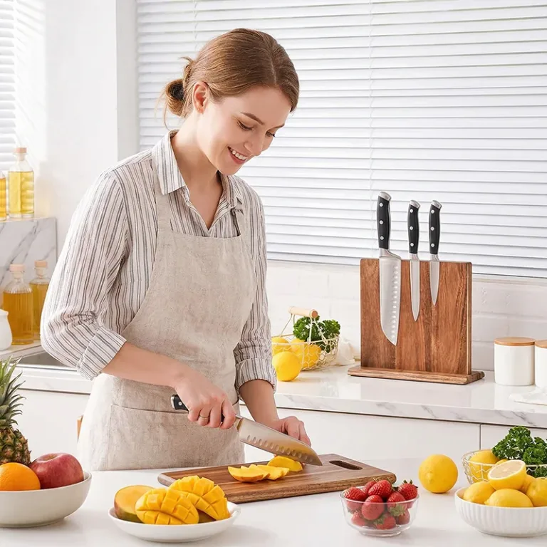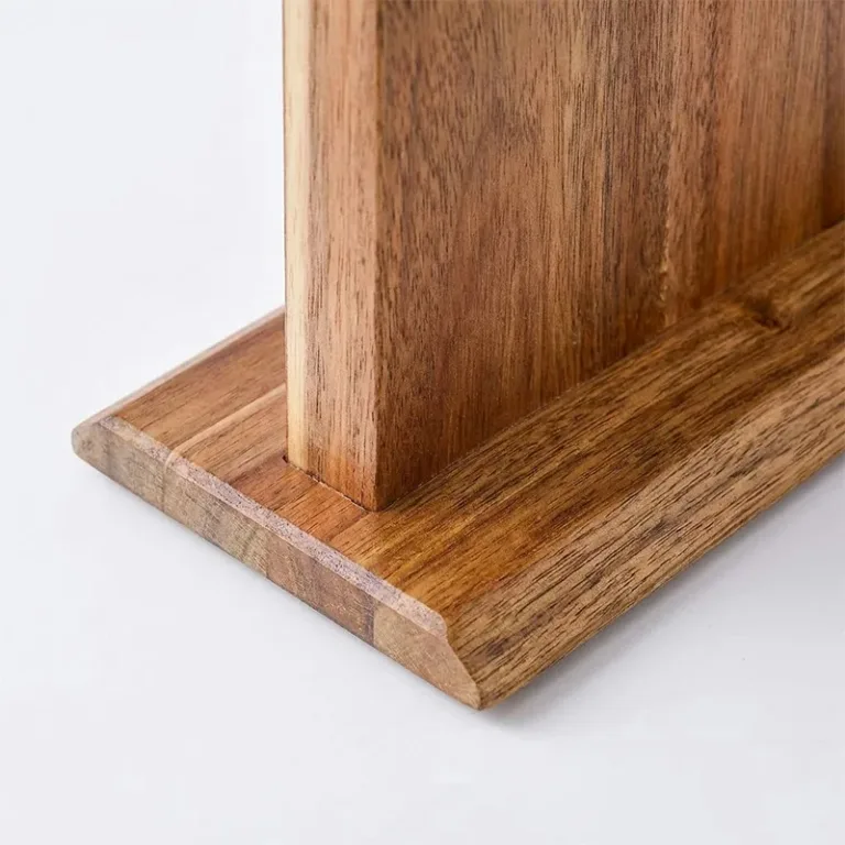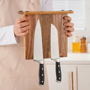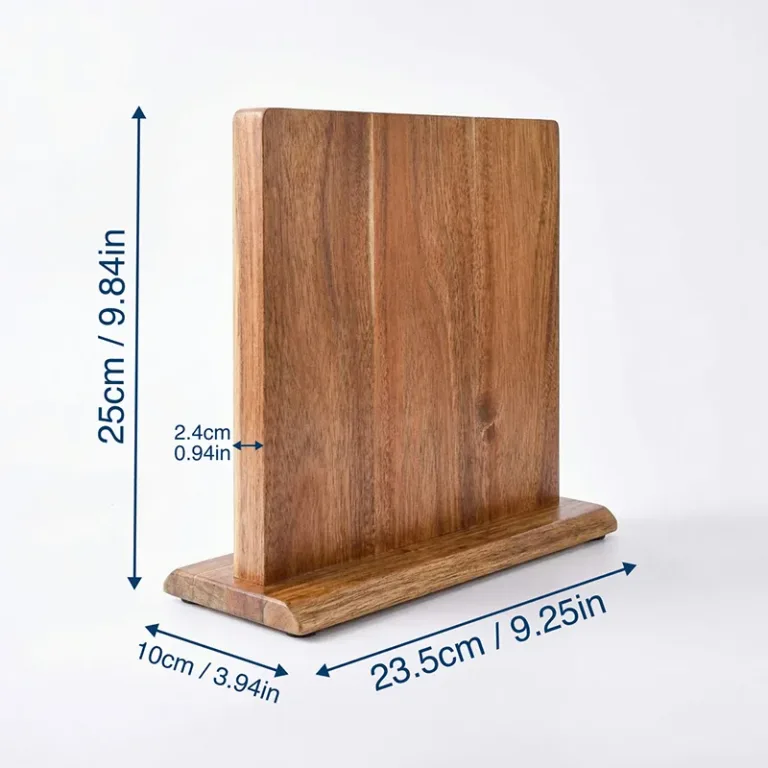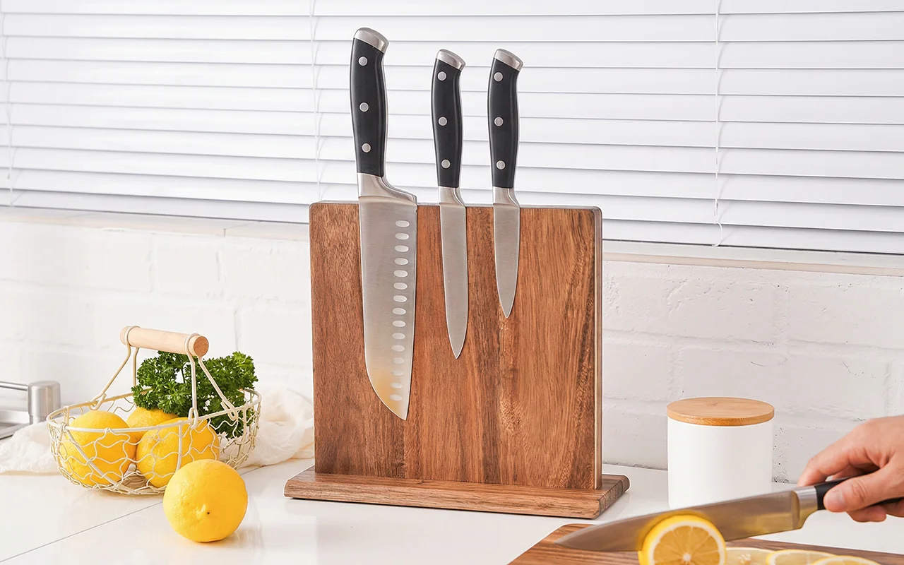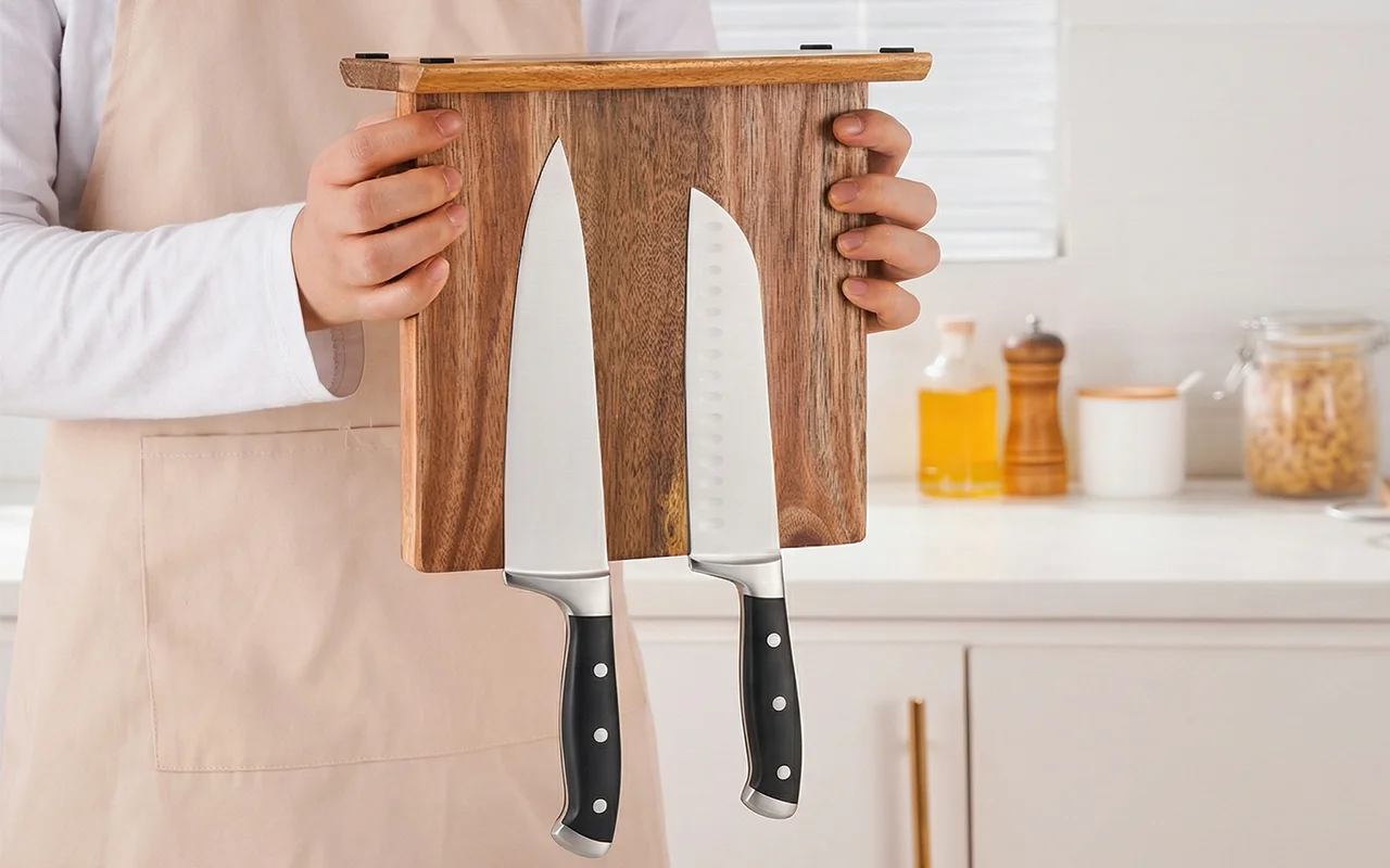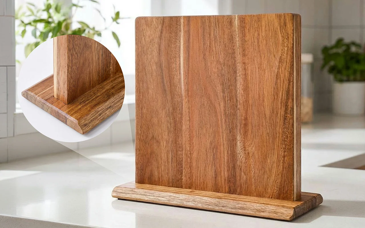 Suportul din lemn Nygex eliberează instantaneu sertarele aglomerate și blaturile dezordonate. Magneții puternici ascunși mențin lamele ferm în loc, în timp ce muchiile rămân perfect ascuțite. Suprafața netedă din salcâm rezistă la zgârieturi și se șterge ușor după gătit. Fibra naturală se potrivește bucătăriilor moderne, creând un spațiu de pregătire calm și organizat.