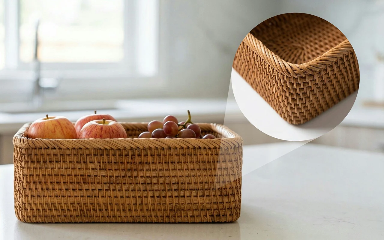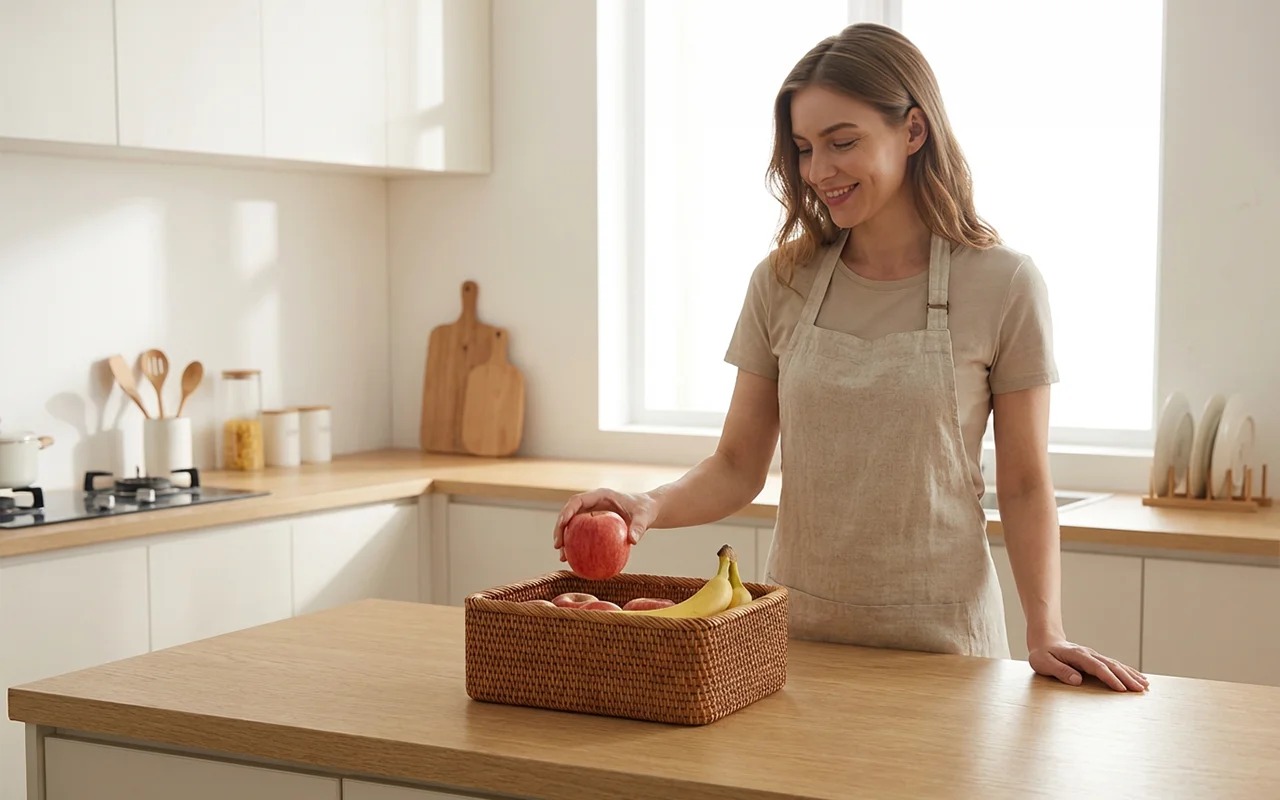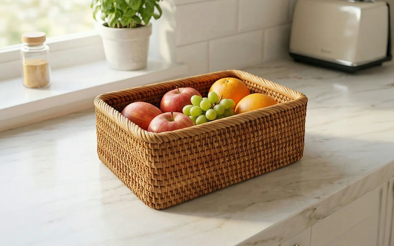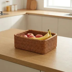 Coșul Nygex adună alimentele împrăștiate într-un singur loc la îndemână. Construcția din ratan împletit manual se simte netedă, rămânând în același timp fiabilă și rezistentă. Laturile deschise permit circulația aerului, ajutând fructele preferate să rămână proaspete mai mult timp. Forma simplă se potrivește ușor pe rafturi, făcând dulapurile aglomerate să pară spațioase.